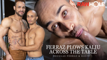 This scorching gay porn threesome ignites into a fiery spit roast when Kadu plows his bareback cock in from behind while Italo is slurping down Gustavo’s big brown meat. The bed quakes and Italo can barely keep his balance to grab his dick and beat off. Gustavo takes over and pumps his cock into Italo’s well-fucked ass while the young bottom takes Kadu’s monumental meat into his mouth. The dark muscle boys pull him to the edge of the bed and tag team his horny ass, leaving him dripping cum from nuts to hole.